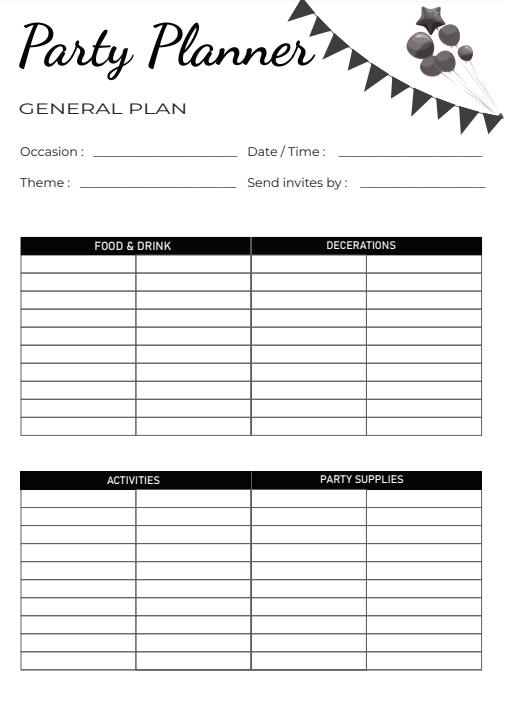 Organising an event is easier said than done. It requires great diligence, discipline and consistency. Why? Simply because there are so many things to take care of! Guests, invitations, rentals, meals and drinks, entertainment options, and decorations are just a few of the many things that come up during party planning. This is why you need our ‘Ultimate Party Planner’ printable (in black and white). Organising has never been easier!